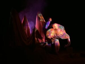 Face à cette montagne, comment traverser la nuit ? Dans un immense bac à sable, le décor se transforme au gré des rêves et des pensées de Sacha. Des figures naissent et s’effacent, et parmi elles, un allié inattendu : un éléphant. Un guide lent et puissant, venu d’une autre histoire, pour l’aider à cheminer vers le matin.