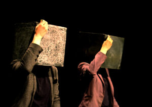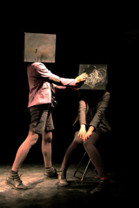 Face à face, deux drôles de silhouettes s’observent. La tête emboîtée dans des cubes noirs, elles font défiler sous leur craie un ciel étoilé, une ville en noir et blanc, un oiseau coloré ou de multiples émotions… Entre jeu masqué et théâtre d’objets, c’est toute une histoire qui se dessine, se devine et parfois s’efface, pour mieux s’inventer. Un voyage surréaliste et poétique destiné aux tout-petits !